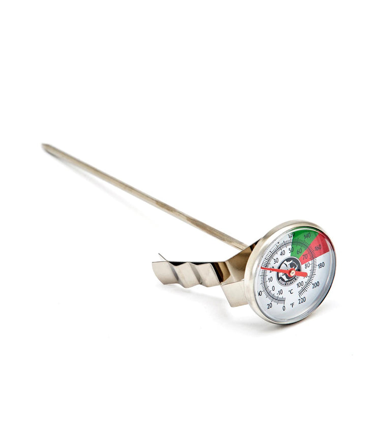 The easy to read dial on the Rhino Coffee Gear Milk Thermometer allows for quick and accurate measure of textured milk and other beverages. The specially designed stainless steel clip allows the thermometer to sit perfectly in any milk pitcher. Designed with positive lock, quick-release action, the thermometer stem can be adjusted to the desired height. When the clip is removed, the thermometer can also be used for general purpose cooking needs.
